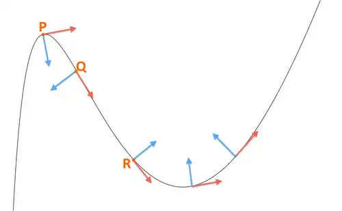 A curvatura de uma curva diferenciável foi originalmente definida através de círculos osculantes . Nesse cenário, Augustin-Louis Cauchy mostrou que o centro da curvatura é o ponto de interseção de duas linhas normais infinitamente próximas da curva.[1]