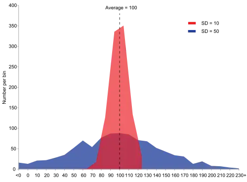 Exemplo de amostras de duas populações com médias iguais e desvios padrões diferentes. A população representada em vermelho tem média 100 e desvio padrão 10. A população representada em azul tem média 100 e desvio padrão 50.
