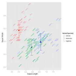 O desvio padrão é usado para indicar, com barras de erro, a incerteza do posicionamento do centroide de cada grupo da amostra ao longo da direção indicada pela largura das sépalas.