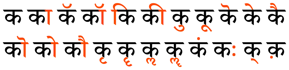 | Devanagari | अ | क | आ | का | ॲ | कॅ | ऑ | कॉ | इ | कि | ई | की | उ | कु | ऊ | कू | ऎ | कॆ | ए | के | ऐ | कै | ऒ | कॊ | ओ | को | औ | कौ | ऋ | कृ | ॠ | कॄ | ऌ | कॢ | ॡ | कॣ | अं | कं | अः | कः | क् |