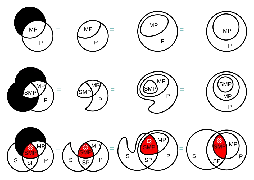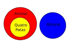 Assim, um diagrama de Venn contendo os atributos para Animal, Mineral e quatro patas teria que conter intersecções onde alguns estão em ambos animal, mineral e de quatro patas. Um diagrama de Venn, consequentemente, mostra todas as possíveis combinações ou conjunções.