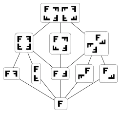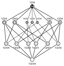 O diagrama de Hasse seguinte também mostra as partições de um conjunto com quatro elementos, ordenados pela relação de refinamento. O diagrama da esquerda enfatiza o fato dos elementos 0...4 formarem uma reticulado. Todo o reticulado não é simplesmente um semirreticulado dobrado como no exemplo do hipercubo acima. O segundo diagrama é simétrico refletido. As arestas no meio seriam todas verticais, mas para torná-las discrimináveis elas estão desenhadas levemente curvadas. O terceiro diagrama enfatiza a estrutura graduada do reticulado. Todos os elementos com o mesmo rank estão no mesmo nível do diagrama de Hasse, mas muito da simetria está perdida.