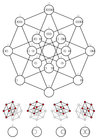 O diagrama mais a esquerda deixa claro que o conjunto das partes é um poset graduado. O diagrama do meio tem a mesma estrutura graduada, mas ao fazer algumas arestas maiores do que outras ele dá enfase na construção do conjunto das partes como a união de dois cubos tridimensionais: os vértices do cubo abaixo (esquerda) representam subconjuntos que não contém um elemento particular (digamos d) de S, enquanto que o de cima (direita) representa os subconjuntos que contém d. O diagrama mais a direita mostra algumas das simetrias internas da estrutura.