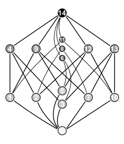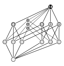O exemplo seguinte mostra o problema. Considere o conjunto das partes do conjunto S = {a, b, c, d}, i.e. o conjunto de todos os subconjuntos de S, ordenado pela relação de inclusão . Abaixo estão três diagramas de Hasse diferentes para esta ordem parcial (Note que cada subconjunto S’ tem o vértice nomeado com uma codificação 1-0 de para cada um dos quatro elementos, sendo ('1') se está ou ('0') se não está presente em S’.):