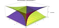 O gráfico que acompanha mostra a diferença entre a média aritmética e a média geométrica para os parâmetros de forma e de 0 a 2. Apesar do fato de que a diferença entre elas aproxima-se de zero conforme e aproximam-se do infinito e que a diferença se torna larga para valores de e aproximando-se de zero, pode-se observar uma assimetria evidente da média geométrica com respeito aos parâmetros e . A diferença entre a média geométrica e a média aritmética é maior para valores pequenos de em relação a do que quando trocando as magnitudes de e .