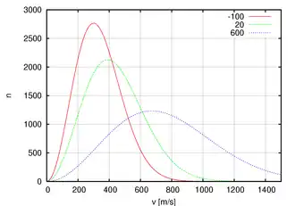Assim, a velocidade média das moléculas a uma certa temperatura é dada por , a velocidade mais provável de ser encontrada é dada por e a velocidade quadrática média é dada por .[1] Dessa forma, é possível esboçar um gráfico semelhante ao da imagem ao lado, no qual fica mais fácil de visualizar a distribuição.