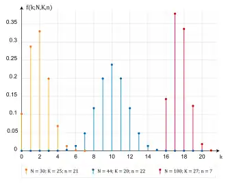 Uma variável aleatória segue a distribuição hipergeométrica se a função massa de probabilidade for dada por[1]