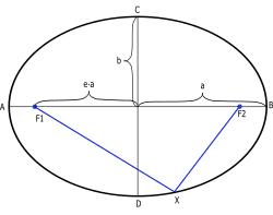 Tem-se (de novo, apenas no caso da circunferência, o caso corresponderia ao segmento de reta, mas normalmente corresponde a uma parábola). Se for o semi-eixo maior e o semi-eixo menor da elipse, então pelo teorema de Pitágoras vem