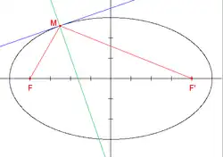 A elipse tem a propriedade de que a bissectriz do ângulo formado pelos dois focos e por um ponto qualquer da elipse (como vértice) é perpendicular à tangente à elipse nesse ponto.