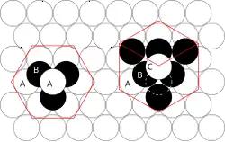 Relativo a uma camada de referência com posicionamento A, dois posicionamentos mais, B e C, são possíveis. Toda e qualquer sequência A, B, e C sem repetição imediata da mesma é possível e fornece um empacotamento de mesma densidade para esferas de um dado raio.