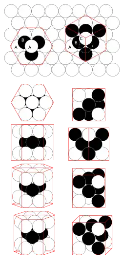 Em um empacotamento denso, o espaçamento centro-centro das esferas no plano x–y é uma tesselação simples similar a uma colméia com um afastamento (distância entre os centros das esferas) de um diâmetro de esfera. A distância entre os centros das esferas, projetada no eixo z (vertical) é: