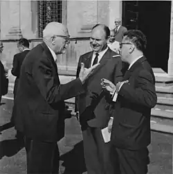 ![]() International Symposium on Algebraic Geometry, Roma, 1965. Enrico Bompiani em conversa com Giovanni Battista Rizza e Vittorio Dalla Volta. | |