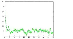 Ao lado segue uma figura mostrando uma simulação numérica da expressão genética usando a equação mais simples possível, estudada em.[9] A linha contínua mostra a simulação de forma paralela da solução determinística. Usa-se o método de Euler para equações estocásticas, ou como conhecido método de Euler-Maruyama;[10] ver Método de Euler-Maruyama. Um dos pontos positivos da teoria atual do cálculo estocástico reside no fato de que em esperança matemática, expected value, a versão estocástica sempre converge para a versão determinística, isto tem sido explorado em modelos conhecidos como "caixa cinza", ver [11]