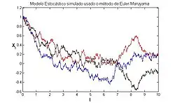 Ao lado segue a solução, repetida três vezes, usando o método de Euler Maruyama. Ver para mais exemplos e detalhes.[15]