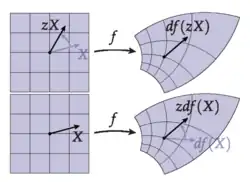 Onde e . Uma matriz desta forma é a representação matricial de um número complexo. Geometricamente, tal matriz é sempre a composição de uma rotação com escala e, particularmente, preserva os ângulos. O Jacobiano de uma função pega segmentos de reta infinitesimais na interseção de duas curvas em z e os gira para os segmentos correspondentes em . Por consequência, uma função que satisfaça as equações de Cauchy-Riemann, com uma derivada diferente de zero, preserva o ângulo entre as curvas no plano. Isto significa que, as equações de Cauchy-Riemann são as condições para uma função ser conforme .