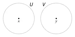 Os pontos x e y, separados por suas respectivas vizinhanças U e V.
