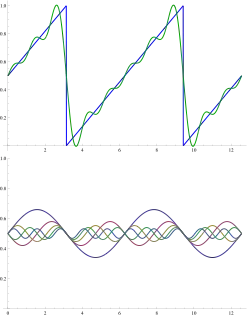 O exemplo da adição dos primeiros termos de uma série de Fourier para uma função dente de serra é mostrado na figura. As funções de base são ondas senoidais com comprimentos de onda λ/n (para n inteiro) mais curtos do que o comprimento de onda λ do próprio dente de serra (exceto para n = 1, a onda fundamental).