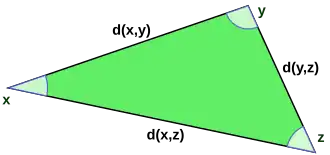 A norma é a função de valor real[12] e a distância entre dois pontos em H é definida em termos da norma por Aqui, é uma função de distância[13], significando primeiramente que é simétrica em e em segundo lugar que a distância entre e ele próprio é zero, e caso contrário a distância entre e deve ser positiva, e por fim que a desigualdade triangular se verifica, significando que o comprimento de um lado de um triângulo xyz não pode exceder a soma dos comprimentos dos outros dois lados:[14]