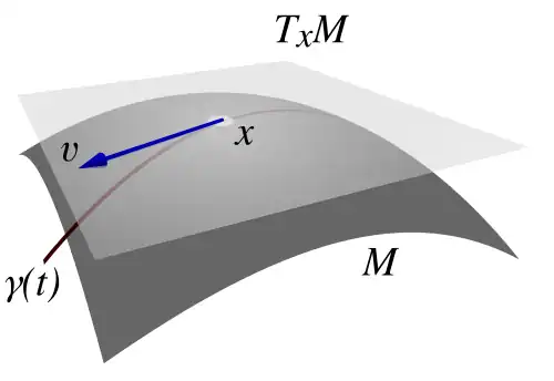 2. Sejam M uma variedade arbitrária e x um ponto em M. Dizemos que um vetor v está no espaço tangente à M em x se existe uma curva (Isto é, uma curva com um domínio em um aberto e imagem na variedade, em outras palavras, tal curva está contida na variedade e é bem definida, no sentido de que sua derivada existe (por isso temos que a imagem de está na variedade M) tal que e .