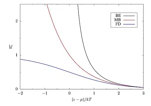 Nota-se que um sistema de bósons possui uma maior ocupação dos estados, devido aos efeitos quânticos de simetria da função de onda do sistema [11]. Nesta distribuição identifica-se que para o regime as distribuições quânticas de Bose-Einstein (BE) e Fermi-Dirac (FD) se aproximam da distribuição clássica de Maxwell-Boltzmann (MB), que representa o regime de baixas densidades e altas temperaturas, ou seja, o limite clássico [12].