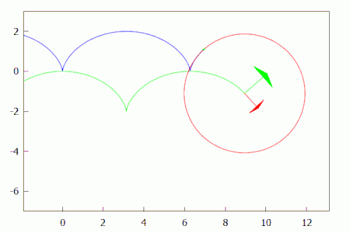 Isso significa que, quando o centro de curvatura de cada ponto de uma curva é desenhado, a forma resultante será a evoluta dessa curva. A evoluta de um círculo é, portanto, um único ponto em seu centro.[2] Equivalente a isso, uma evoluta é o invólucro das normais a uma curva.