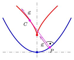 - As normais da curva dada em pontos de curvatura diferente de zero são tangentes à evoluta, e as normais da curva em pontos de curvatura zero são assíntotas da evoluta. Portanto: a evoluta é o invólucro das normais da curva dada.
