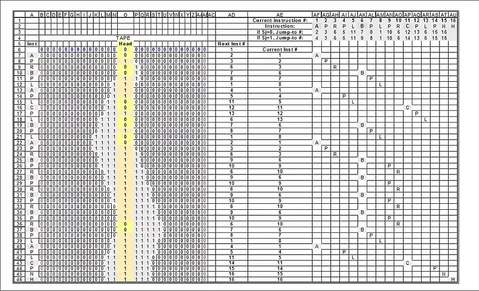 A "execução" completa do castor ocupado 3-estados. Os resultantes do estados de Turing (o que Turing denominados "configurações-m" & mdash; "máquinas-configurações") são mostrados em destaque em cinza na coluna A, e também sob instruções da máquina (colunas AF-AU))