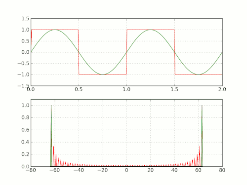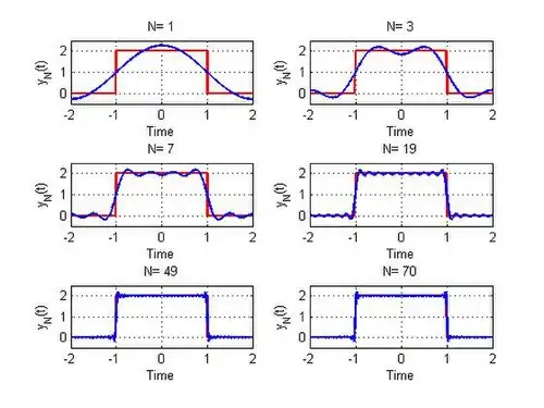 As figuras ilustram o fenômeno de Gibbs para uma onda quadrada f(t) (com amplitude e período ), a qual é representada pela série: