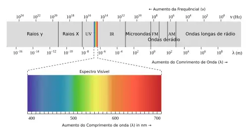 A luz visível é uma onda eletromagnética, composta de oscilações de campos elétricos e magnéticos que viajam através do espaço. A frequência da onda determina sua cor: 4×1014 Hz é a luz vermelha, 8×1014 Hz é a luz violeta, e entre essas frequências (na faixa de 4-8×1014 Hz) estão todas as outras cores do arco-íris. Uma onda electromagnética pode ter uma frequência inferior a 4×1014 Hz, mas será invisível ao olho humano, tais ondas são chamados de radiação infravermelha (IR). Para uma frequência menor, a onda é chamada de micro-ondas e em frequências mais baixas ainda é chamada de ondas de rádio. Do mesmo modo, uma onda eletromagnética pode ter uma frequência superior a 8×1014 Hz, mas será invisível ao olho humano e são chamadas de ondas de radiação ultravioleta (UV). Mesmo ondas de alta frequência são chamados de raios-X, e maior ainda de raios gama.[4]