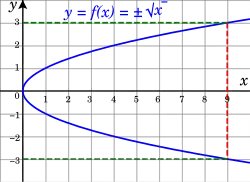 Por exemplo, ao definir a raiz quadrada como a função inversa da função quadrática, para qualquer número real positivo há duas escolhas para o valor da raiz quadrada, uma das quais é positiva e denotada por e outra que é negativa e denotada por Essas escolhas definem duas funções contínuas, ambas tendo os números reais não negativos como domínio, e tendo os números reais não negativos ou não positivos como imagens. Ao olhar para os gráficos dessas funções, pode-se ver que, juntas, elas formam uma única curva suave. Portanto, é frequentemente útil considerar essas duas funções de raiz quadrada como uma única função que tem dois valores para x positivo, um valor para 0 e nenhum valor para x negativo.