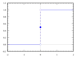 Em matemática e estatística, a função de Heaviside (ou função degrau), desenvolvida pelo matemático e engenheiro eletricista Oliver Heaviside, é uma função singular e descontínua com valor zero quando o seu argumento é negativo e valor unitário quando o argumento é positivo.[1] Nos casos em que o argumento é nulo seu valor assume a média dos limites laterais da função (pela esquerda e pela direita) na abscissa em que está definida a descontinuidade. A função degrau padrão tem a descontinuidade em x = 0. Normalmente a função é usada como uma distribuição, mas costuma-se defini-la por: