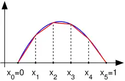 Uma função linear em trechosUma função (azul) e uma aproximação linear em trechos dela (vermelho).Uma função linear em trechos em duas dimensões (acima) e os politopos convexos nas quais ela é linear (abaixo).