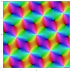 é uma função meromorfa no plano complexo com um duplo polo a cada ponto do retículo. É duplamente periódico com os períodos 1 e τ; isto significa que satisfaz