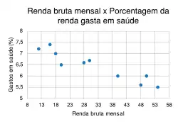A saúde é um dos setores que mais movimenta dinheiro na sociedade. Para entender quais famílias gastam determinada porcentagem da sua renda com saúde, é possível construir o gráfico de dispersão ao lado (ver figura 3). A partir do gráfico entende—se que uma família com alta renda bruta dedica uma porcentagem menor dela para a manutenção da saúde da sua própria família. Isto é, observa—se uma proporção inversa ou uma relação negativa entre as variáveis. A tendência mostra que quanto maior a renda bruta, menor a porcentagem da renda gasta com saúde em uma família.[27]