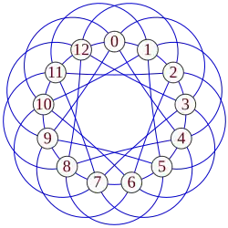 ![]() O Grafo Paley de ordem 13, um grafo fortemente regular com parâmetros gfr(13,6,2,3). |