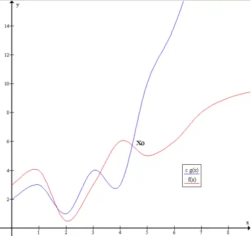 se e somente se existe uma constante positiva M tal que para todo valor suficientemente grande de x, o valor absoluto de f(x) é no máximo M multiplicado pelo valor absoluto de g(x). Isto é, f(x) = O(g(x)) se e somente se existe um número real positivo M e um número real x0 tal que