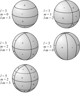 Os harmónicos esféricos são facilmente visualizados através da contagem do número de cruzamentos que ambos estão na direção das coordenadas e . Para obter a orientação sobre , as funções associadas de Legendre possuem zeros, enquanto que na coordenada as funções trigonométricas seno e cosseno possuem zeros.