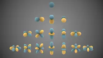 O modelo quântico moderno do átomo de hidrogênio assume o elétron em um estado constante de energia tem sua posição distribuída ao redor do núcleo atômico como uma distribuição de probabilidades, cuja variação angular é dada por um harmónico esférico.