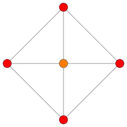 ![]() Projeção estereográfica | ![]() uma projeção em 3D do hexadecácoro a partir de uma rotação simples. | ![]() O hexadecácoro tem duas construções de Wythoff, uma forma regular e uma forma alternada, mostrada aqui como uma planificação. |