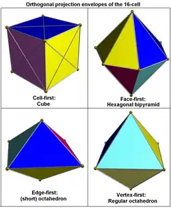 A primeira projeção paralela das células do hexadecácoro no espaço 3D tem um formato cúbico. As células mais próximas e as mais distantes são projetadas em tetraedros inscritos dentro do cubo, o que corresponde a duas maneiras possíveis para inscrever um tetraedro regular em um cubo. Ao redor de cada um destes há 4 outros tetraedros (não regulares). As demais 6 células são projetadas nas faces quadradas do cubo. Nessa projeção, todas as bordas convergem para as faces cúbicas.[11]