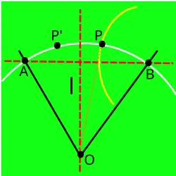 Trissectando um ângulo (AOB) usando uma hipérbole de excentricidade 2 (curva amarela).