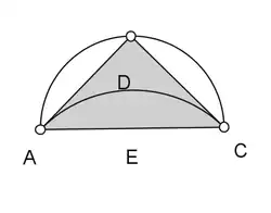 .A partir de um trapézio isósceles CDNM inscrito em um círculo em que o quadrado sobre o lado maior CD seja igual à soma dos quadrados sobre os três lados menores congruentes CM, MN e ND; isto é, a razão entre o quadrado da base maior e o quadrado de cada lado congruente do trapézio é de 3 para 1. Em se construindo sobre CD (base do trapézio) um segmento circular CED equivalente aos que estão sobre os três lados congruentes, a lúnula CMNDE é equivalente ao trapézio CDNM.[2]