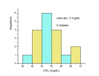 A frequência cumulativa está ligada à soma dos valores de frequência relativa. Por exemplo, para o gráfico de frequência cumulativa soma–se em ordem crescente o valor de uma frequência relativa de uma classe qualquer com todas as classes com valores inferiores. Este gráfico é útil para obter informações a respeito de uma faixa de valores. Por exemplo, na tabela acima observa–se que 61,11% das amostras têm valor inferior a 55 mg/dL.[56] Desta forma obtém-se o gráfico abaixo que representa os histogramas da frequência relativa e acumulativa, indicando a frequência absoluta em cada classe.