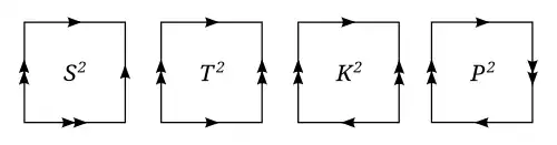 As bordas do quadrado podem então ser coladas de volta de diferentes maneiras. O quadrado pode ser torcido para permitir que as arestas se encontrem na direção oposta, como mostrado pelas setas no diagrama. Até a simetria, existem quatro maneiras distintas de colar os lados, cada um criando uma superfície diferente: