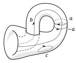 é a garrafa de Klein, que é um toro com uma torção nele (a torção pode ser visto no diagrama quadrado como a inversão da seta em um dos lados). É um teorema que a superfície re-colada pode ter auto-interseção (quando imerso em 3-espaço Euclidiano). Como no toro, os círculos a e b não podem ser reduzidos enquanto c pode ser. Mas ao contrário do toro, seguindo o b avança para a direita e vice-versa para a esquerda e para a direita, porque b passa a cruzar a torção dada a uma junção. Se um corte equidistante de um lado de b for feito, ele retorna do outro lado e volta pela superfície uma segunda vez antes de retornar ao seu ponto de partida, cortando uma faixa de Möbius torcida. Como a esquerda e a direita locais podem ser arbitrariamente reorientadas dessa maneira, a superfície como um todo é dita não-orientável.