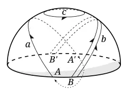 O plano projetivo tem ambas as colagens "torcidas". A forma não cortada, geralmente representada como a superfície do menino, é visualmente complexa, de modo que uma inserção hemisférica é mostrada no diagrama, em que os pontos antipodais ao redor da borda, como A e A', são identificados como o mesmo ponto. Novamente, a e b são não-reduzíveis enquanto c é. Mas desta vez, ambos a e b invertem à esquerda e à direita.
