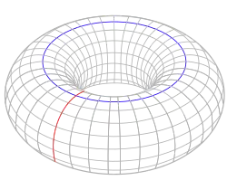 O Toro é definido como o produto cartesiano de dois círculos . O toro tem uma única componente conexa por caminhos, e dois buracos unidimensionais independentes (indicados pelos círculos vermelho e azul) e um buraco bidimensional como o interior do toro. Os grupos de homologia correspondentes são[17]