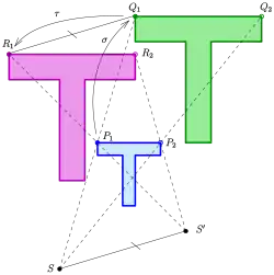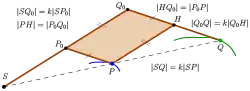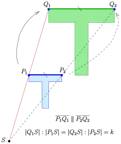 Como (ver diagrama) do teorema da interseção, obtém-se que os pontos são colineares e a equação é sustentada. Demonstra-se assim que o mapeamento é uma homotetia com centro e proporção .