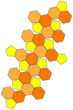 Tem 12 faces pentagonais regulares e 20 hexagonais regulares.