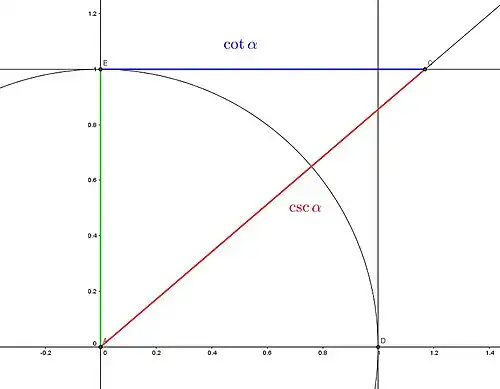 Finalmente, as funções trigonométricas de razão recíproca, secante (), cossecante () e cotangente (), das funções cosseno, seno e tangente, respectivamente: